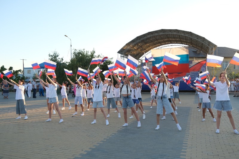 Открыли мероприятие Гимнами Российской Федерации и Астраханской области. Перед торжественной частью танцевальные коллективы «Фианиты» и «Акку» организовали масштабный флешмоб с флагами. Их поддержали учащиеся филиала Астраханского агротехнического колледжа в селе Красный Яр.