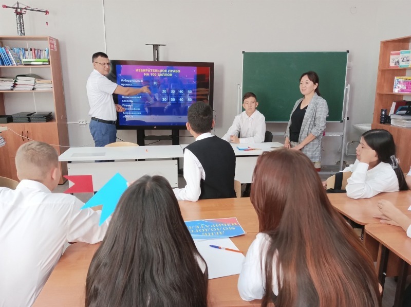 Познавательное мероприятие проходило в кабинете «Точка роста» МКОУ «Красноярская СОШ № 2». На него были приглашены девятиклассники. Проводили информационный час педагог дополнительного образования обособленного структурного подразделения ЦВР «Подросток» Азамат Хайргалиев и секретарь территориальной избирательной комиссии Красноярского района Оксана Тлекова.