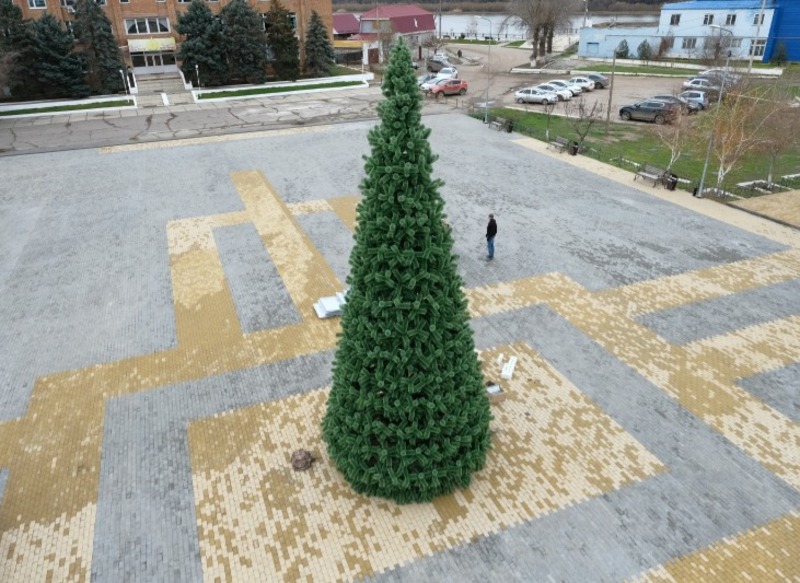 Это подарок Красноярскому району от руководства ООО «Газпром добыча Астрахань». Несколько дней над установкой ели трудились сотрудники данного предприятия. Аккуратно собрали основание, затем корпус. Уже после захода солнца приступили к формированию пышной кроны.