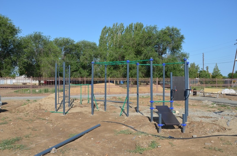 В рамках второго этапа в парке по ул. Советская п. Бузан установлены оборудование для занятия воркаутом и элементы детской игровой площадки. Теперь строителям предстоит оформить покрытие этих зон. Так, на игровой будет нанесён резиновый слой. В первую очередь, рабочим предстоит застелить геотекстиль, затем уложить инертные материалы и после выравнивая залить бетонную площадку. В завершение территорию покроют резиновой крошкой.