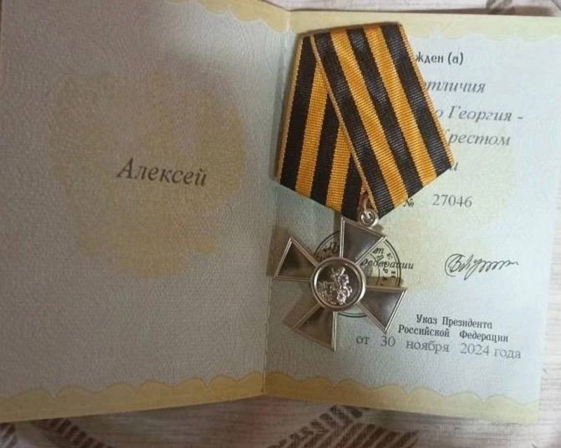 За подвиги, а также проявленные мужество и доблесть в ходе проведения спецоперации Указом Президента Российской Федерации Алексей был награждён знаком отличия ордена Святого Георгия – Георгиевским крестом IV степени.